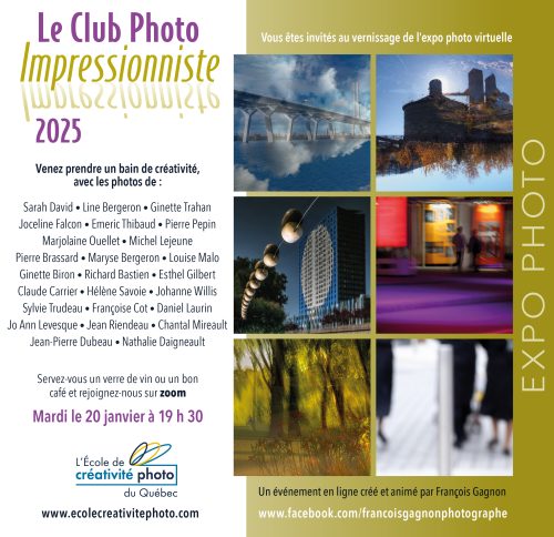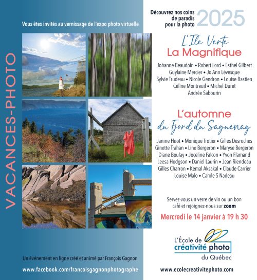 Une exposition photo virtuelle avec un vernissage animé de façon dynamique par François Gagnon conclut chaque atelier. Cet événement festif réunit sans prétention les participants, leurs parents et amis, nos habitués et sera à coup sûr un moment fort stimulant de votre parcours en photo.