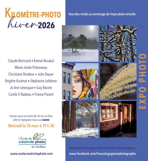 Une exposition photo virtuelle avec un vernissage animé de façon dynamique par François Gagnon conclut chaque atelier. Cet événement festif réunit sans prétention les participants, leurs parents et amis, nos habitués et sera à coup sûr un moment fort stimulant de votre parcours en photo.